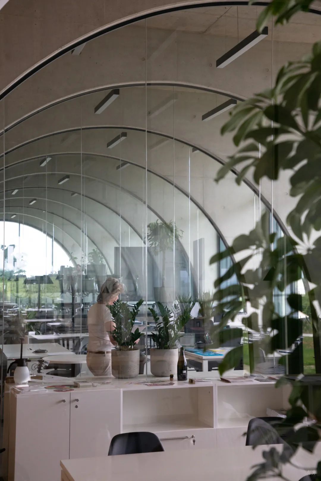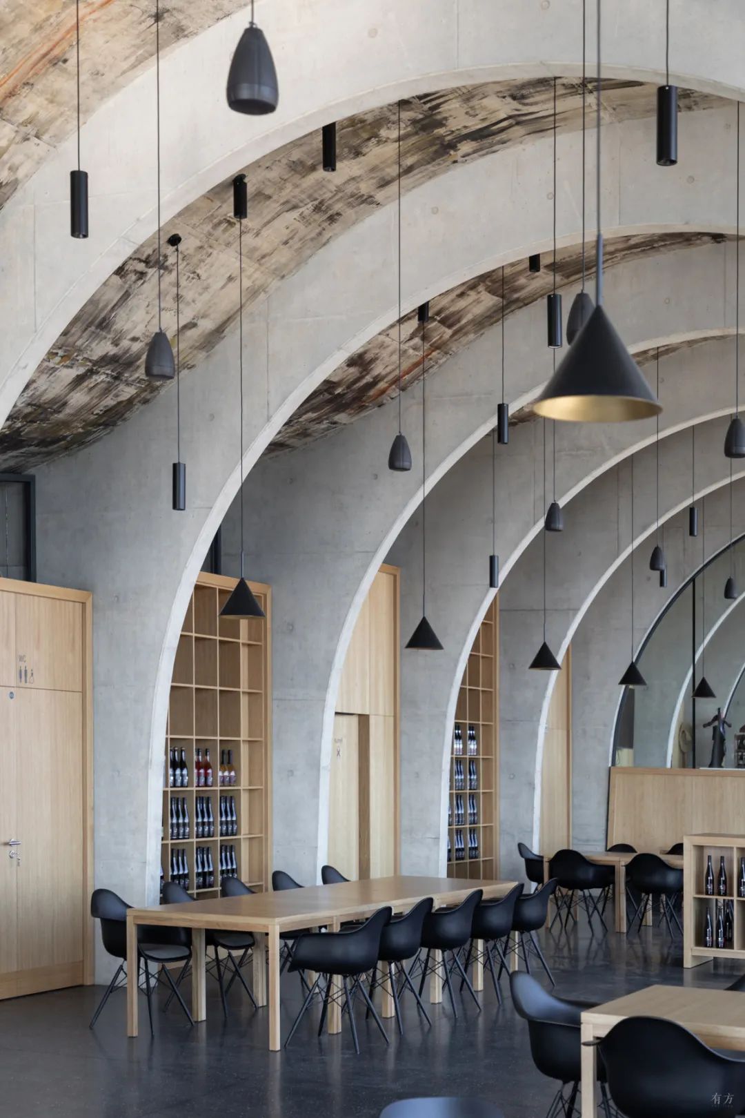 圆形剧场由凹形屋顶顶起,与宽敞的酒窖相连,采用裸露肋骨结构拱门的捷克酿酒厂原型的设计。每个钢筋混凝土拱门都经过单独设计,以适合天花板的特定角度,而拱门之间的距离则与葡萄园葡萄间距保持一致。每个模块都从一行葡萄对应升起并贯穿整个空间,实现了完美的视觉对称性,并引导游客关注葡萄园。整栋建筑朝南而立,四周全部以玻璃幕墙围合,与一列列葡萄树对齐更是为游客中心带来了充足的光线。熟悉了周边的环境后,游客中心邀请游客进入由木材、混凝土和玻璃打造的酒窖中充分体验其产品,在毗邻的品酒室品鉴葡萄酒。捷克当代艺术家PatrikHábl的大型壁画覆盖了整个天花板区域。它那刻意的、不规则的稀疏笔触,从土红色和黑色逐渐转为与当地风接近的棕色和米色,与大地融为一体,在墙上留下了永恒的痕迹。