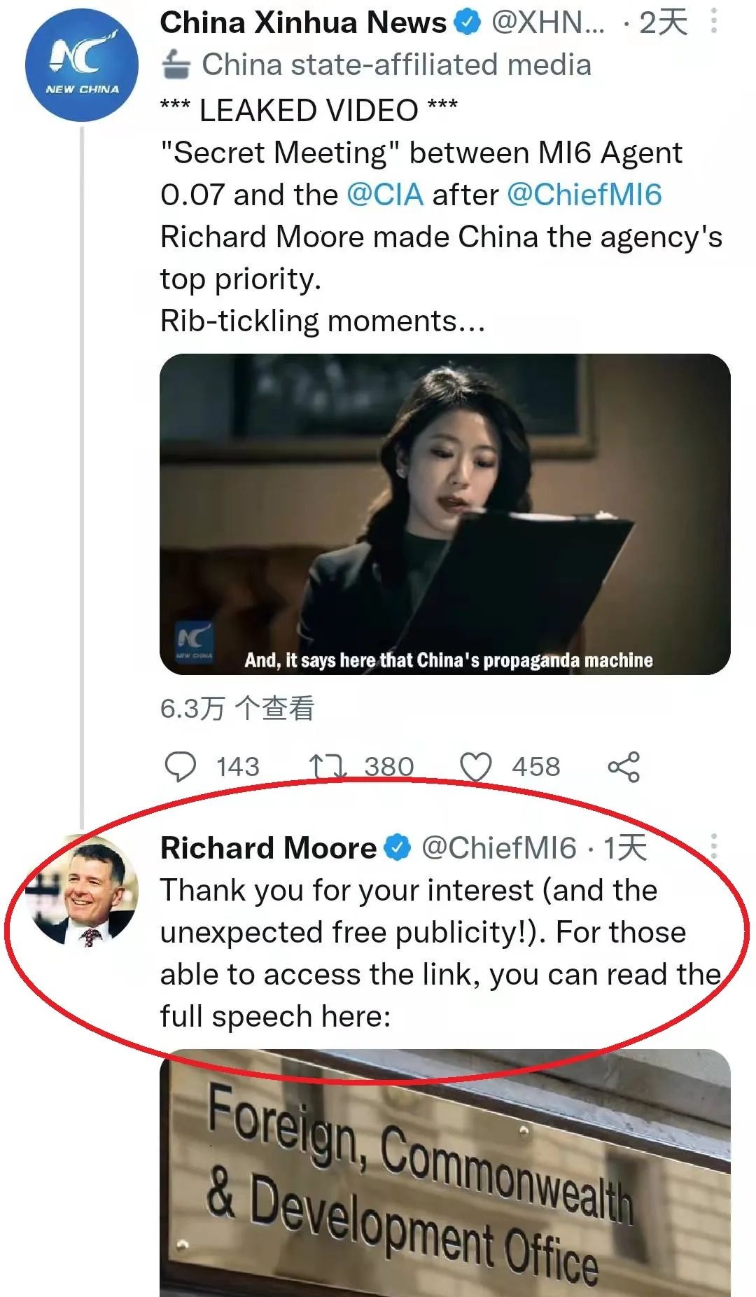 就连被《无暇笑死》无情地嘲讽的007的顶头上司、前不久高调叫嚣“中国威胁论”的英国军情六处(MI6)头目理查德·摩尔也“蚌埠”住了,酸溜溜地在推特上作出尴尬的回应:“谢谢你们的关注以及意想不到的免费宣传。”