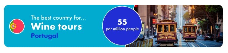 这个国家有两个被联合国教科文组织列为世界遗产的葡萄酒产区,其中一个生产葡萄牙最受认可的波特酒,以波尔图市命名。这种生产独特葡萄酒的国际声誉可能是这个国家拥有最多葡萄酒之旅的原因。葡萄牙也是排名中最大的葡萄酒消费国,该国人均饮酒量为 0.47 升。