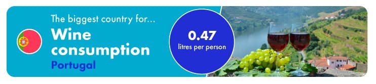 相对于人口而言,这个国家消费的葡萄酒最多,比最近的国家法国领先 800 万升,是其邻国西班牙的两倍多。文化因素可能是造成大量葡萄酒消费的原因,因为许多葡萄牙人认为自己是日常饮酒者,经常在用餐时饮用少量葡萄酒。