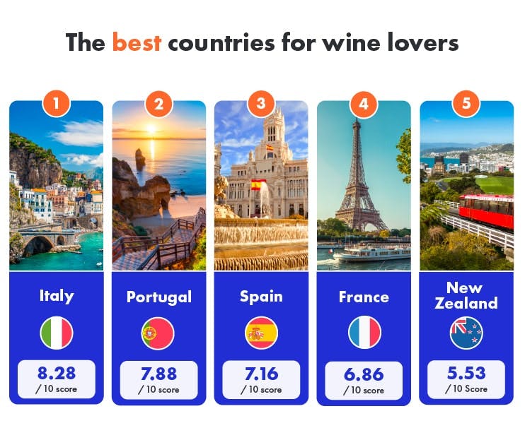 意大利是世界上一些最古老的葡萄酒产区所在地,最著名的是威尼斯和维罗纳等城市的所在地威尼托。意大利在排名中位居榜首。该国大约有 400 种葡萄品种,总有一款适合每个人的口味。它也是排名中最大的葡萄酒生产商,每人生产 0.82 升。