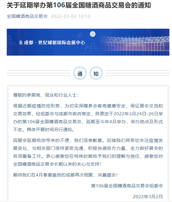 根据近期疫情防控形势,为切实保障参会客商健康安全,保证展会交流和交易效果,经组委会与成都市政府商定,将原定于2022年3月24日-26日举办的第106届全国糖酒商品交易会,延期至今年4月举办,举办地点及形式不变。具体开展时间另行通知。