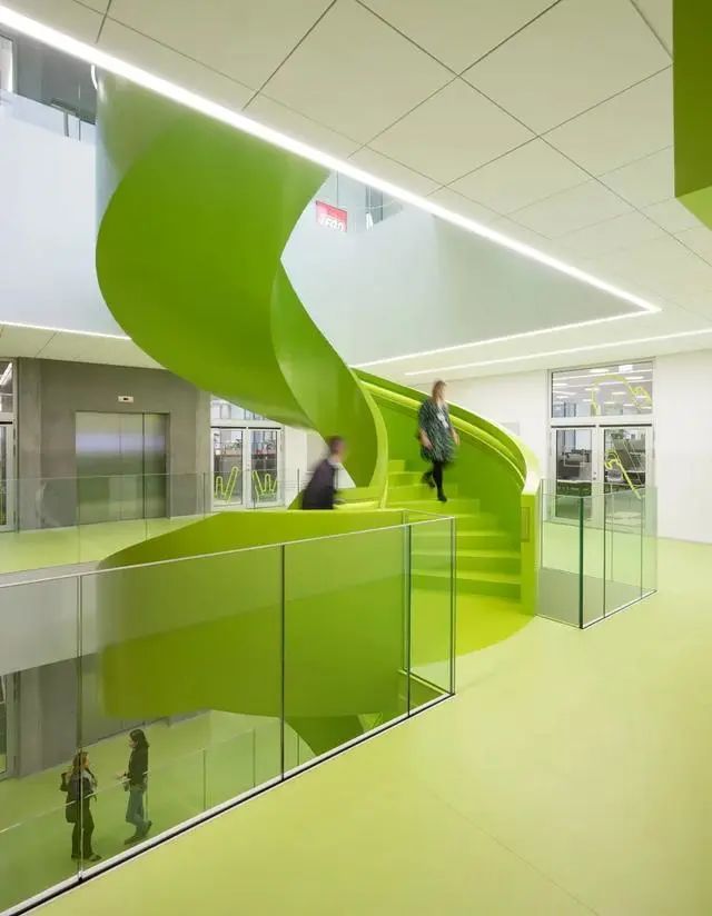 建筑的较高楼层是工作和娱乐活动空间,希望促进员工的创造力和创新能力。在各个建筑的重叠部分,我们设置了包括多色彩楼梯的小广场,作为社交节点和寻路标记。