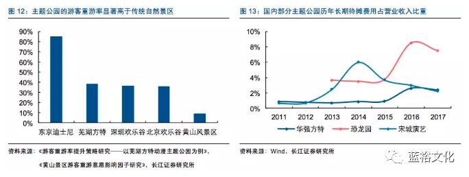 其次,主题公园主要是以体验为主导的游乐项目,游客重游率显著高于自然景区。根据相关学术论文统计,目前国内的自然景区重游率普遍偏低,即便是黄山这样的风景名胜,统计调查的结果也显示游客重游率不足10%。而主题公园吸引游客反复消费的能力显著更强,国内主题乐园的重游率基本在30%以上,而国外优秀的主题公园则更高,东京迪士尼可以到达80%以上。