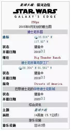 蓝裕文化主题乐园规划设计院发现,迪士尼总是会把火爆的电影搬到乐园中,给游客一种身临其境的感觉。星球大战电影的火爆,最终让迪士尼决定建设三个主题乐园。这就是在洛杉矶迪士尼乐园、奥兰多迪士尼好莱坞影城和巴黎华特迪士尼影城在建的星球大战: 银河边缘项目。今天我们要为大家着重介绍的就加州迪士尼乐园的星战主题乐园:银河边缘。这个以星球大战为主题的园区占地约14英亩(约5.7公顷 )。在2017年的D23展览会中,迪士尼宣布星球大战区域将于2019年开放,加州迪士尼乐园版本在夏季开放,奥兰多迪士尼好莱坞影城版本在秋末开放,每个扩建区域迪士尼的投资额大约为10亿美元。