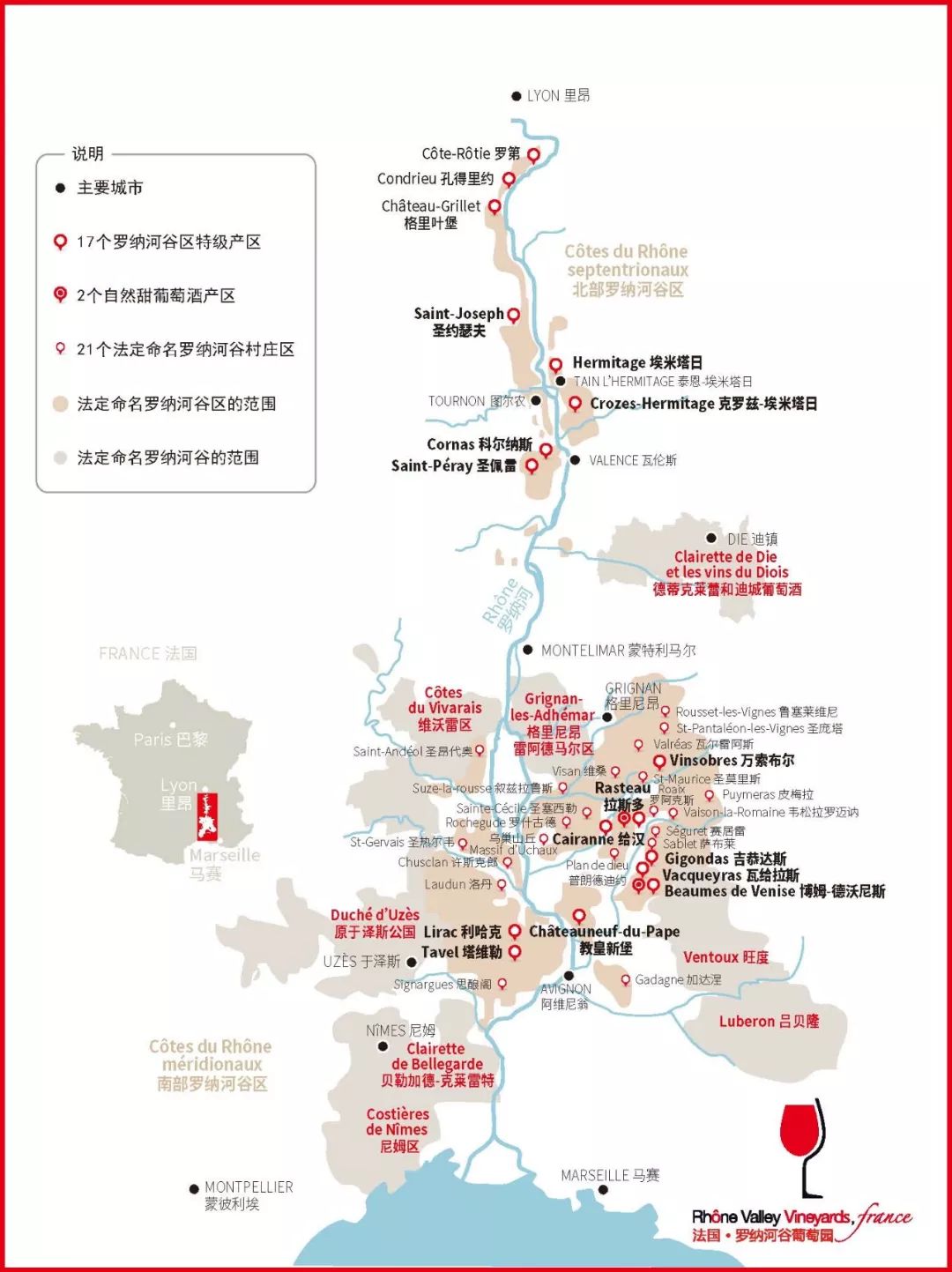 罗纳河谷产区位于法国南部,里昂与普罗旺斯之间。产区分为南北两部分,这不仅仅是地理上的区分,葡萄品种及酒的风格亦有不同。
