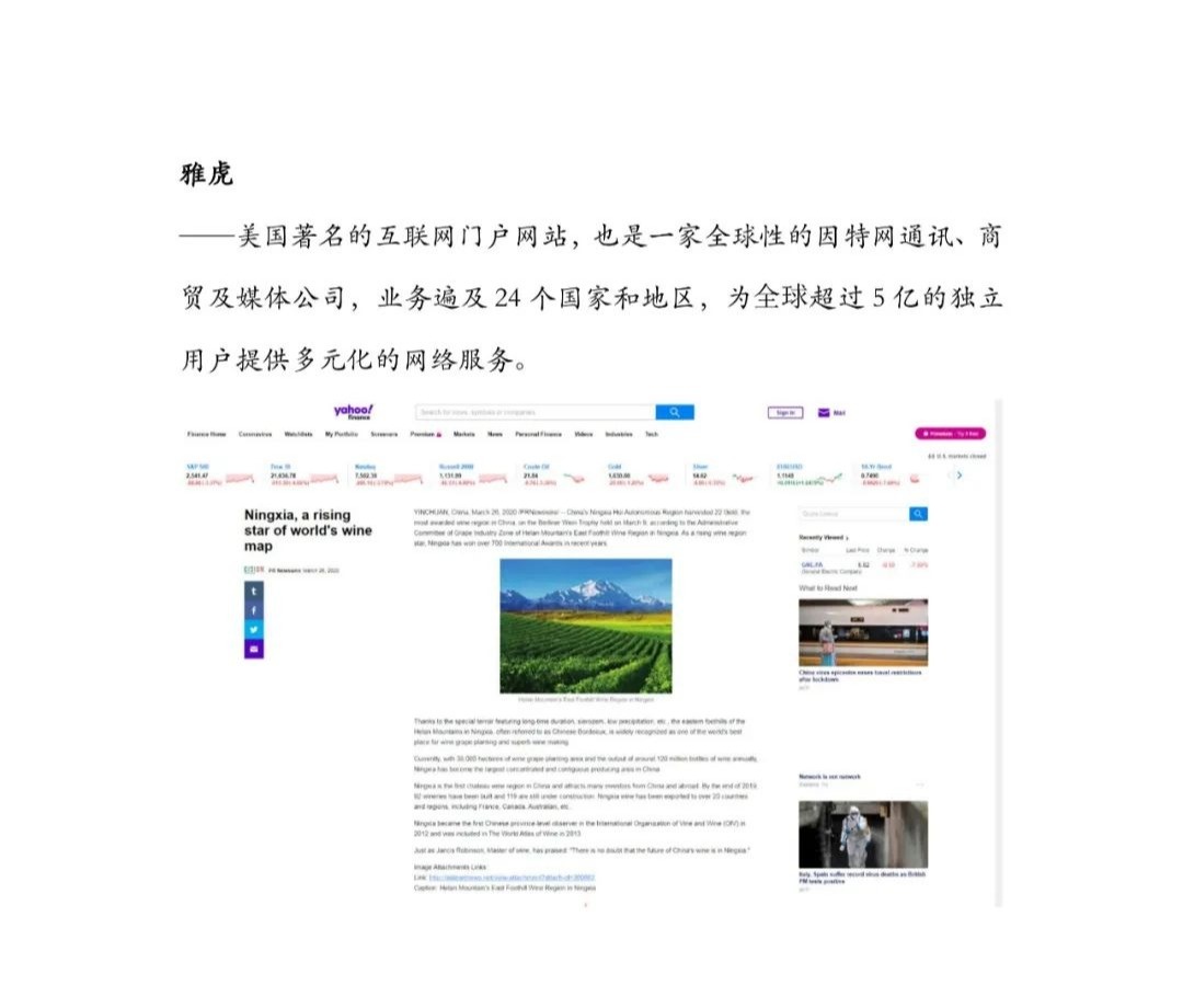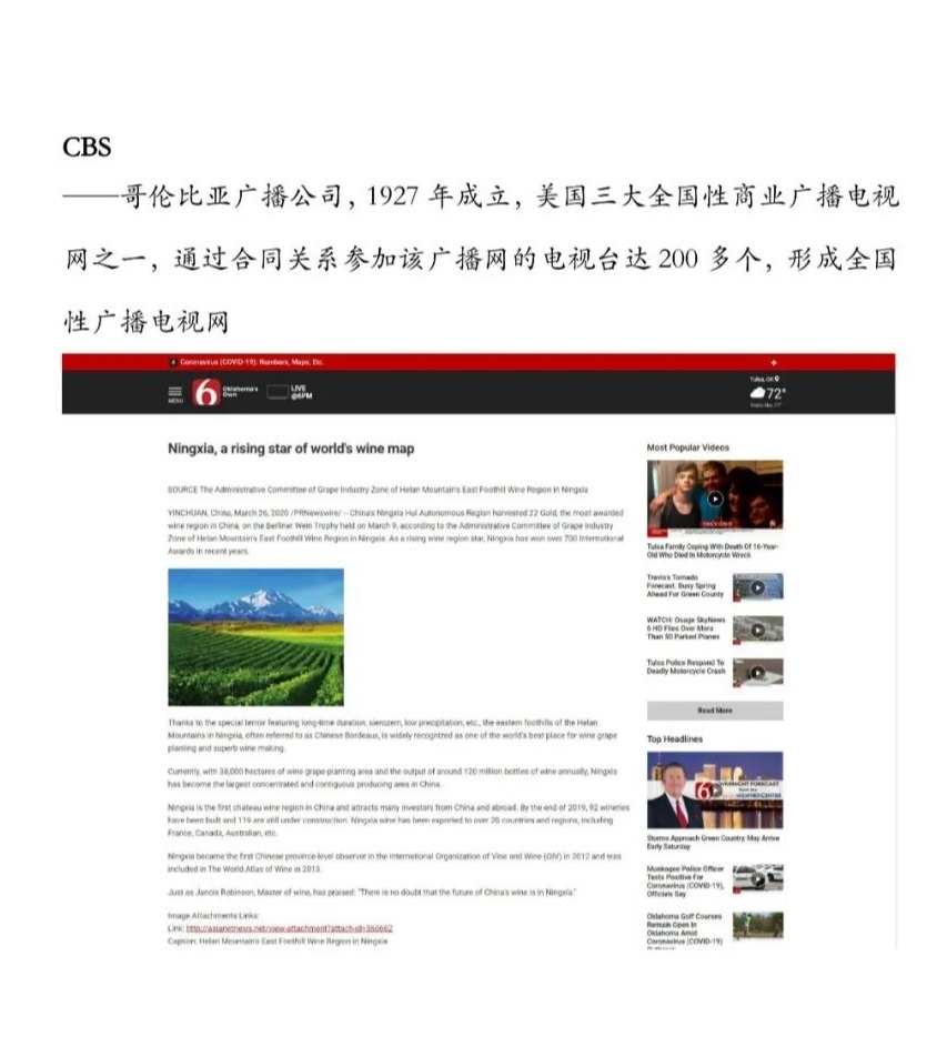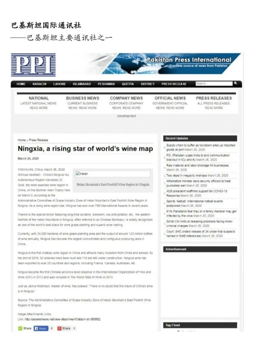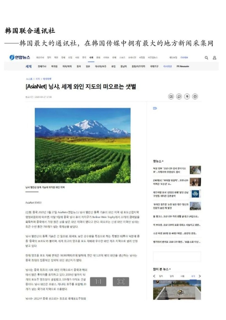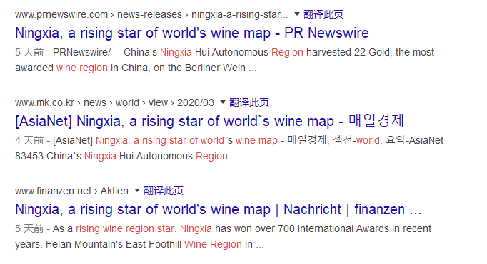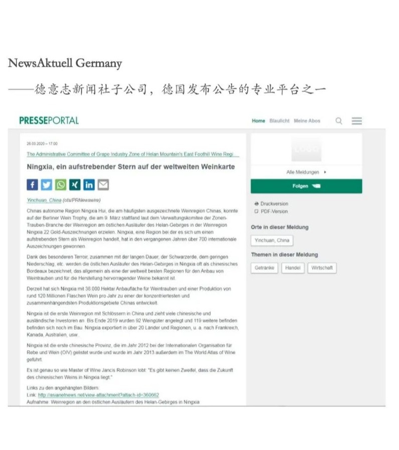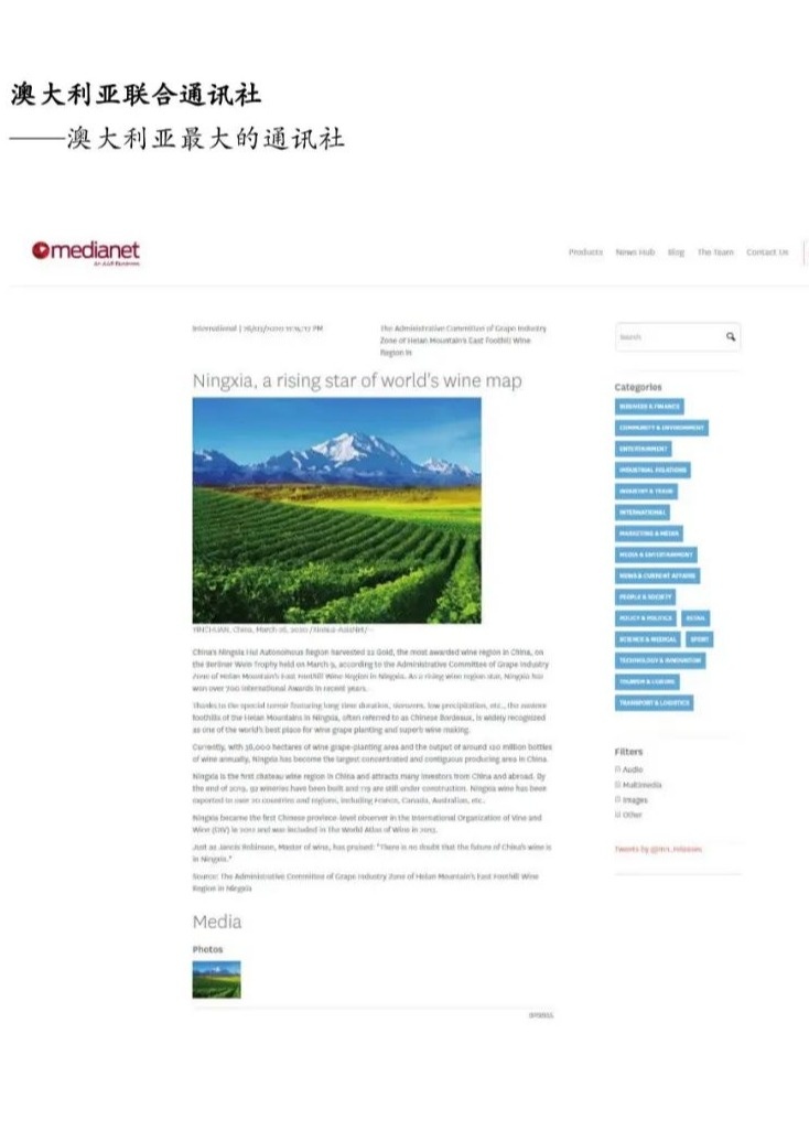 3月27日,新华社新闻信息中心向全球发布英文稿《Ningxia, a rising star of world's wine map》(宁夏——世界葡萄酒版图上崛起的“新星”),稿件在欧美地区和亚太地区九个国家(美国、德国、英国、法国、澳大利亚、日本、韩国、巴基斯坦、泰国)以七种语言同时发布,截至目前已被当地主流媒体、门户网站及重点资讯网站广泛转载,总量逾300家。