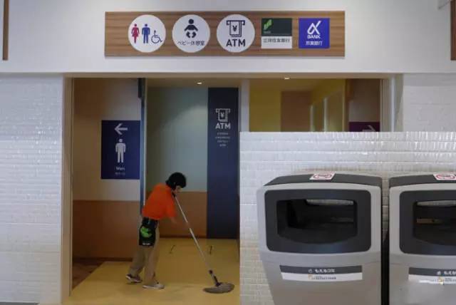 ↑7、8名保洁人员负责购物城的全部清扫工作。分类垃圾桶用洁白的抹布擦得一尘不染。这样清洁的环境也让人更乐意一起保持和维护。