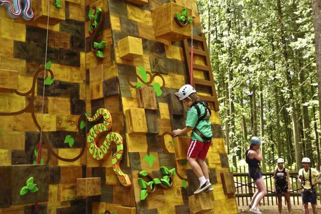 肾上腺素的冒险聚集在一个有趣的冒险塔:印第安娜琼斯”的攀岩墙,天空摇摆,天上掉下来的,交互式攀登墙。