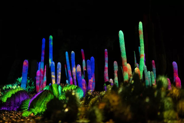 以仙人掌与沙漠为画布,用投影的动态光线画面与音乐联动,在夜间,创造了一场沙漠植物园中的沉浸式之旅。
