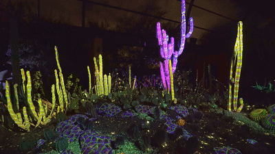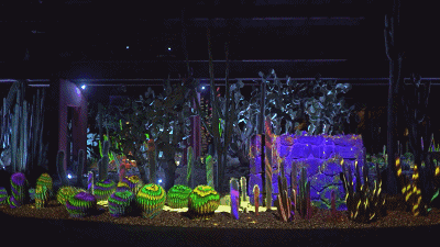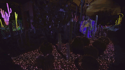 沙漠植物园的Electric Desert拥有七个独立装置。而Cacti Synthesia是其中一个,利用投影和照明,将仙人掌、多肉植物和岩层变成了活生生的夜间画布,使花园及其独特的景观作为新的和令人兴奋的音频和视觉体验的背景。