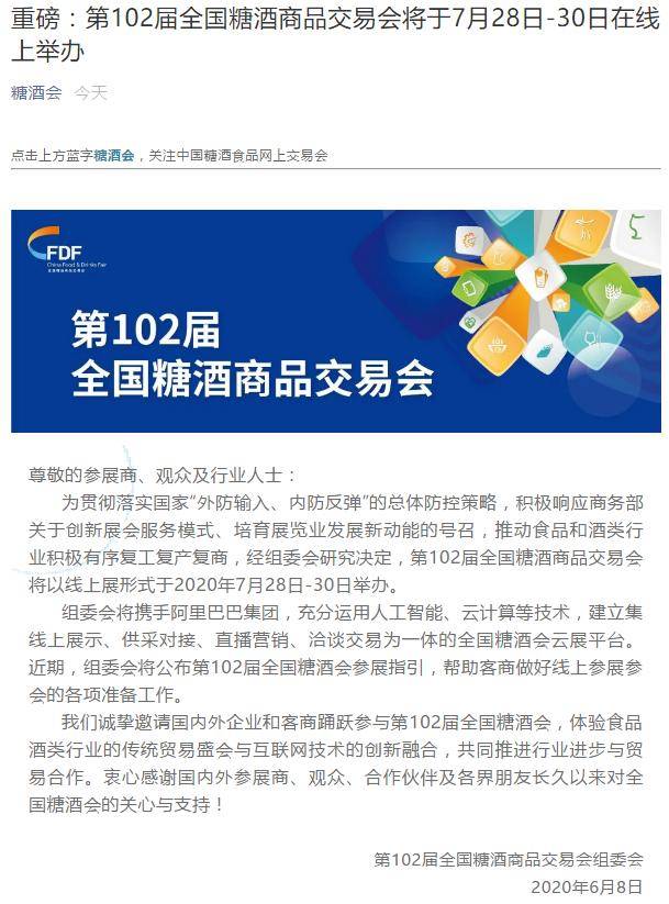 6月8日,全国糖酒商品交易会官方微信公众号发文:第102届全国糖酒商品交易会将于7月28日-30日在线上举办!
