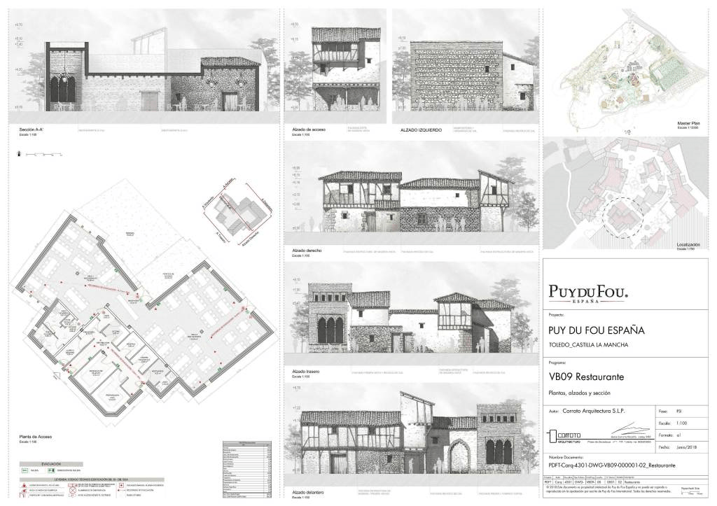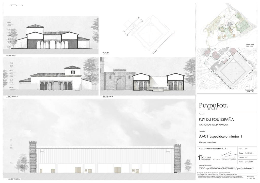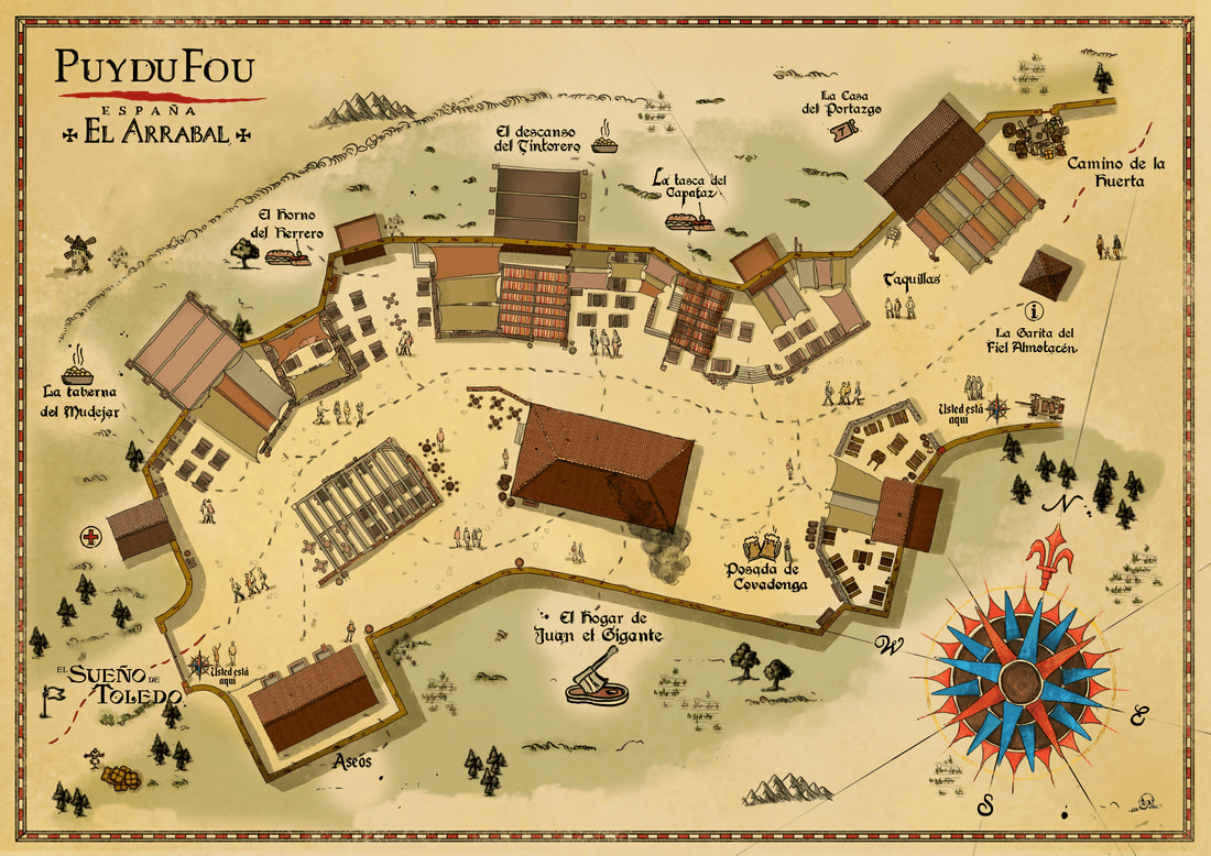 在设计中世纪小镇的建筑物时,考虑了西班牙地理的立面和场景,但最重要的是从传统的托莱多建筑中汲取了历史主义的意象。无论如何,Puy du Fou Toledo旨在模拟传统建筑,而不是100%忠实,这意味着将观察到某些装饰许可证,与该地区的典型建筑形式形成对比。通过形态上异质空间的发展;使用石材,砖块和石灰等材料;以及外墙和人行道的装饰和保养,Pueblo 1 VB旨在使游客沉浸在真实的卡斯蒂利亚中世纪村庄中。外墙将“托莱多索具”和窗户开口与半圆砖拱门和/或多叶阿拉伯拱门混合在一起,以半木墙和玻璃墙的形式保持了流行建筑的美感。即使在某些建筑中,也会有带有半圆形拱门的砖石墙,包括封闭的阿拉伯格子。