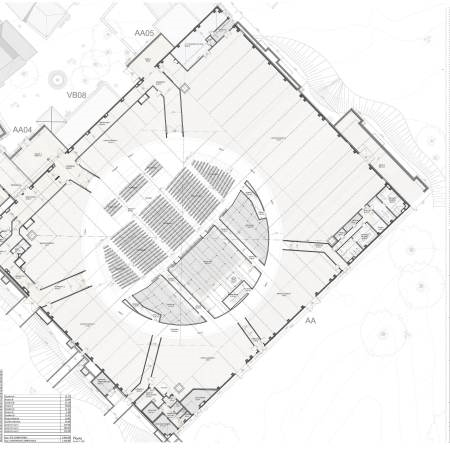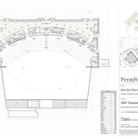 中央主体将配备一个扶手椅露台,该露台安装在直径46米的旋转结构上,允许公众(2,053名观众)和6个外围赛段进行定向。最大旋转速度为1.5 m / s,覆盖角度为720度。场景根据建筑物内的情况和每个人提出的功能需求而改变其形态。编号从最靠近访客入口的舞台(编号1)开始分配,并按逆时针方向分配。