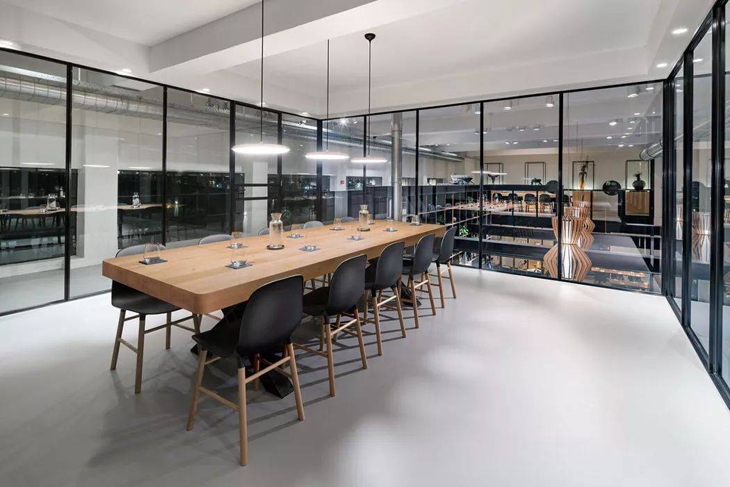 此外,与黑白内饰形成鲜明对比的是,设计师在所有桌子和橱柜的设计中引入了橡木和黄铜。其中,空中吊灯和提供公司未来高端咖啡机的底座也由Bureau Fraai定制。