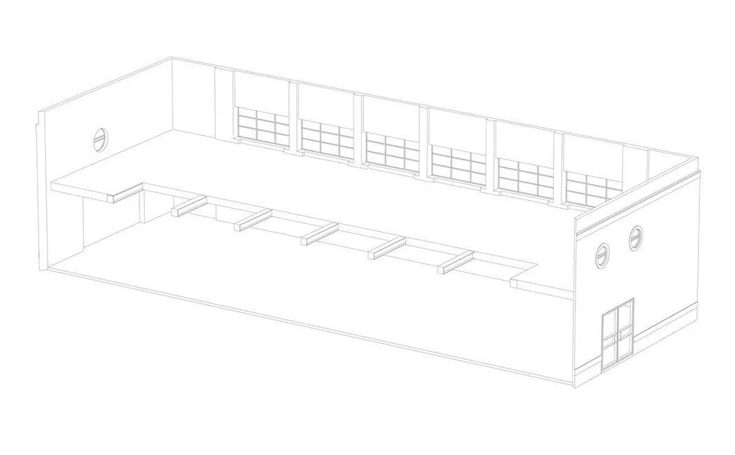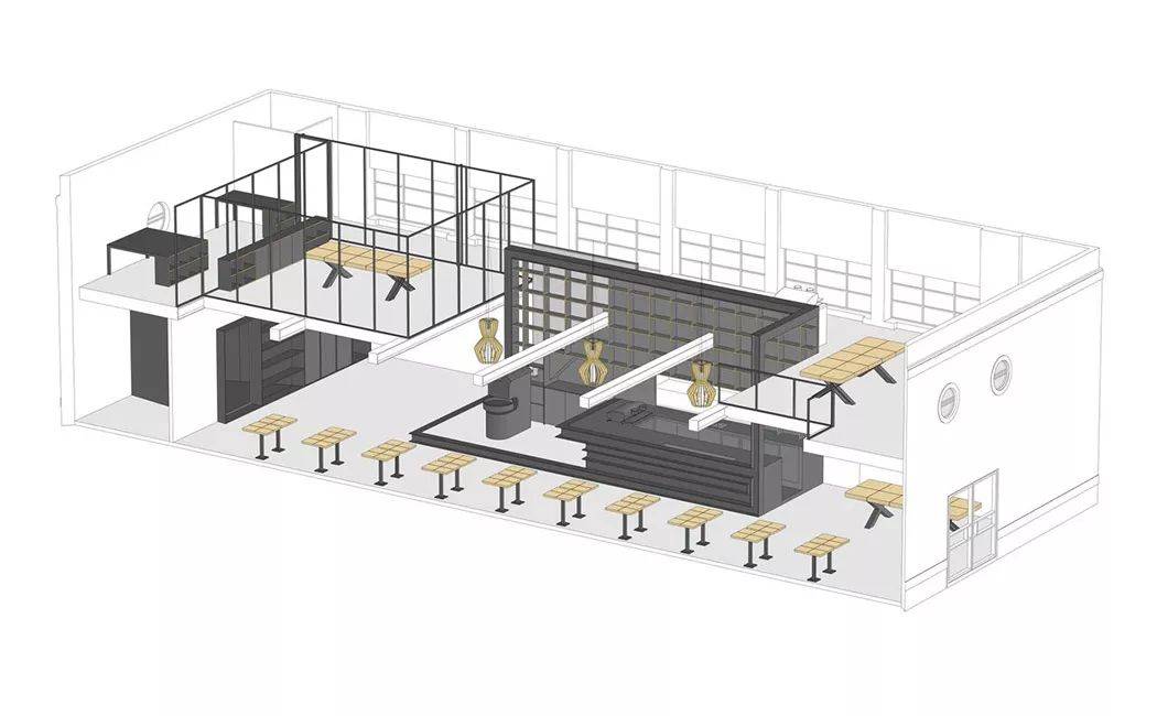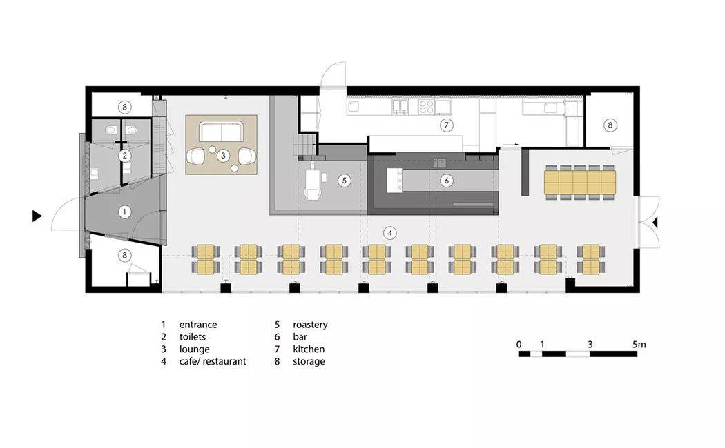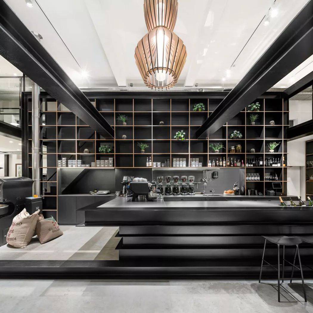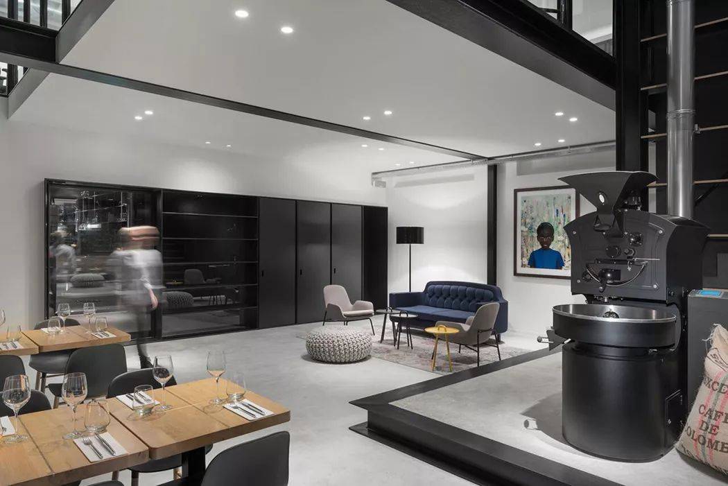 厂房的原有小窗户被5米高的钢窗框架所取代,门窗开放到露台的内部,咖啡厅前面设有码头。咖啡馆设计的主要目的是创造“咖啡”制作和消费的各个方面的全面体验。