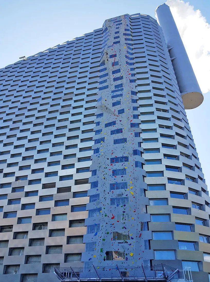 位于建筑的一侧,还有一个高 85m、宽 10m 的攀岩墙,它成功打破世界纪录,成为最高的人工攀岩墙。