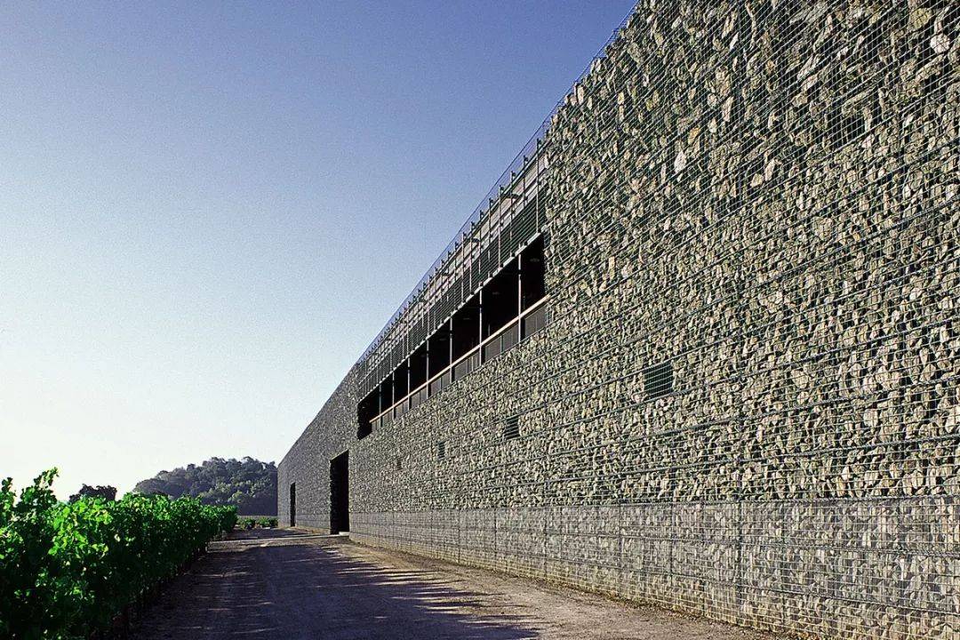 多明纳斯酒庄由克里斯蒂安· 穆埃克斯(Christian Moueix)拥有,这座建筑由瑞士建筑师赫尔佐格和德梅隆(Herzog & De Meuro)设计,于1996年建成,耗资500万美元。这座建筑的独特之处在于其运用石笼材料,这种材料常用于修筑堤坝。这种材料有利于形成天然的屏障来对抗当地极端的天气。