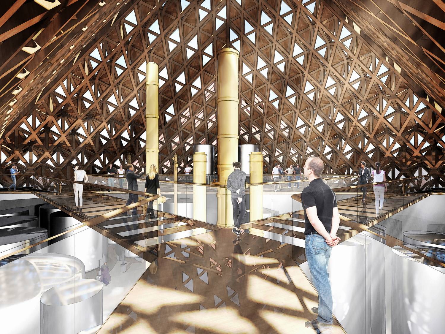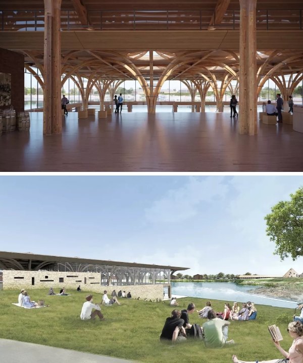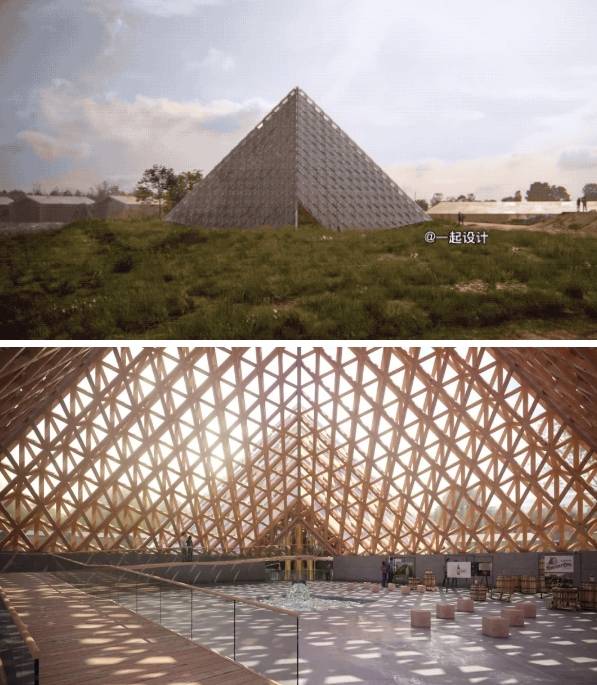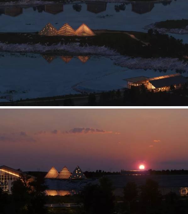 这三座金字塔是用木材和玻璃打造出的菱形结构建筑,金字塔结构会呈现内部和外部。每个结构都将与围绕着讲述波本威士忌的制作过程的视觉元素相结合。现场还有一辆老式晚餐火车,而旧的采石场将改造成一个水池,用于钓鱼和游泳的大池塘。