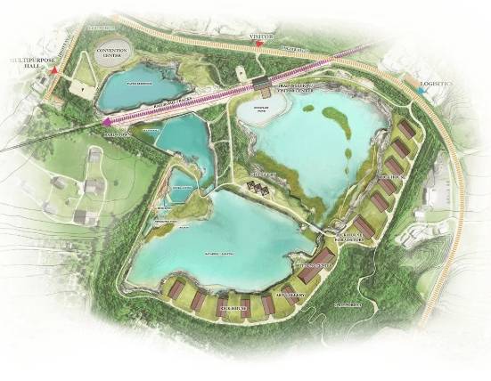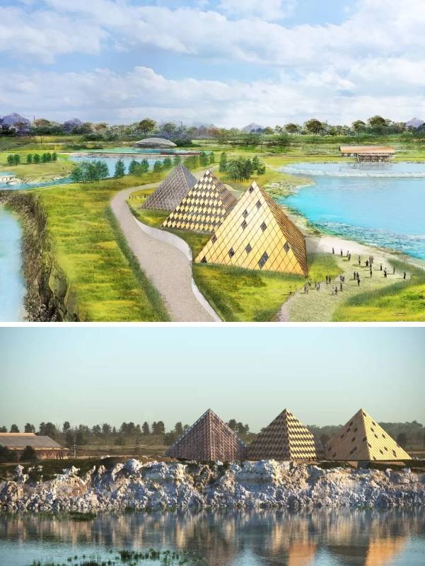 每栋建筑都将采用独特的结构形式,整个园区的焦点将是三个金字塔式建筑物,它们位于场地的中心。同时,采石场将变成人工湖泊,石灰石过滤水形成淡绿色的湖水。