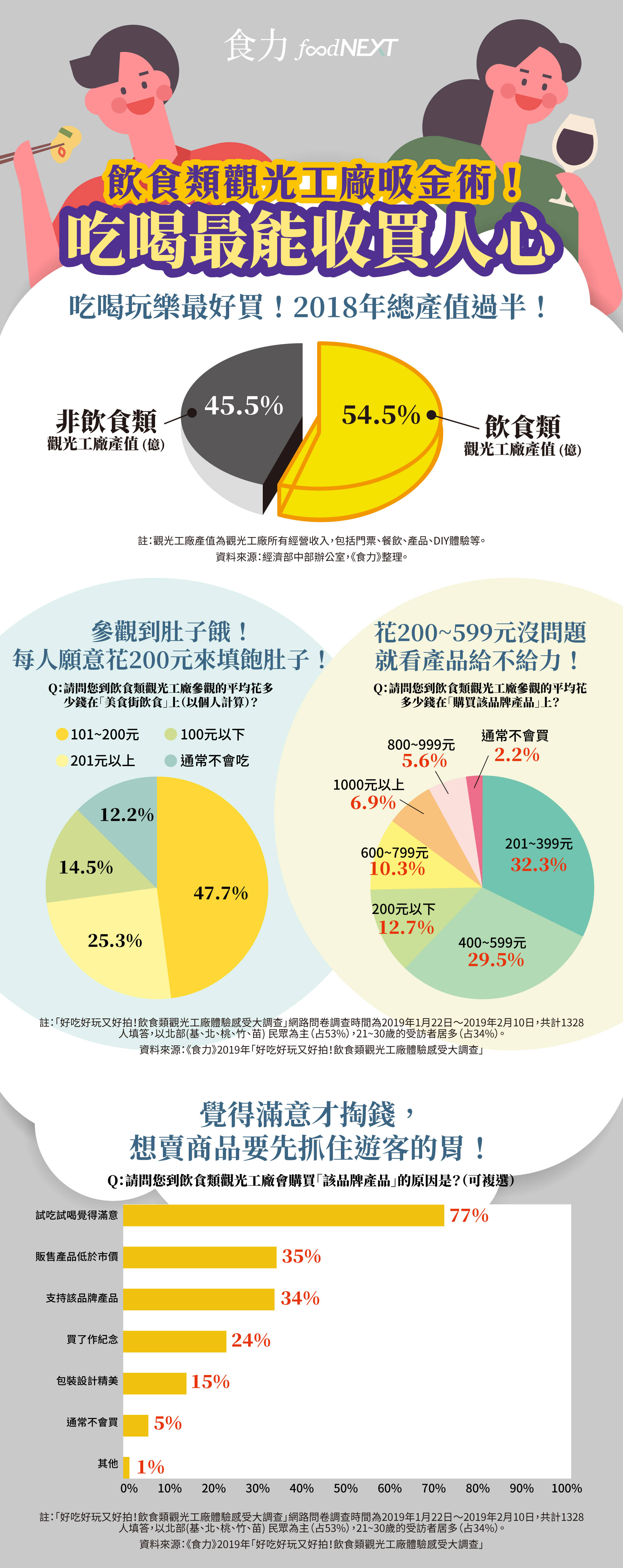 前往饮食类观光工厂时,你会因为看到各种食品工艺流程、闻到阵阵香气而感到饥肠辘辘吗?调查显示,有将近5成(47.7%)的民众平均愿意花费101~200元于美食街饮食上,而有25.3%的民众则愿意花费201元以上来品尝美食,因此若业者能在园区做好美食街或餐厅的规划时,便能加深游客对于自家产品的印象,同时促进游客的消费意愿。