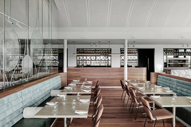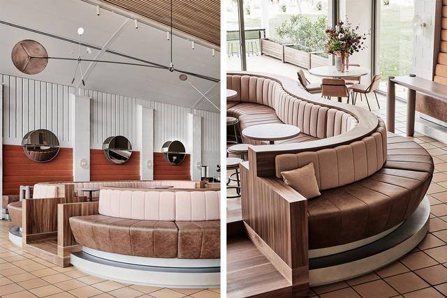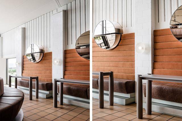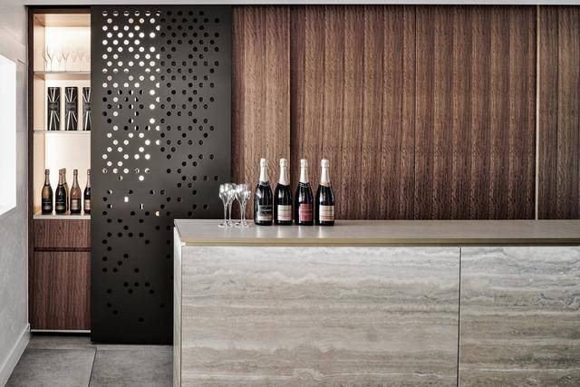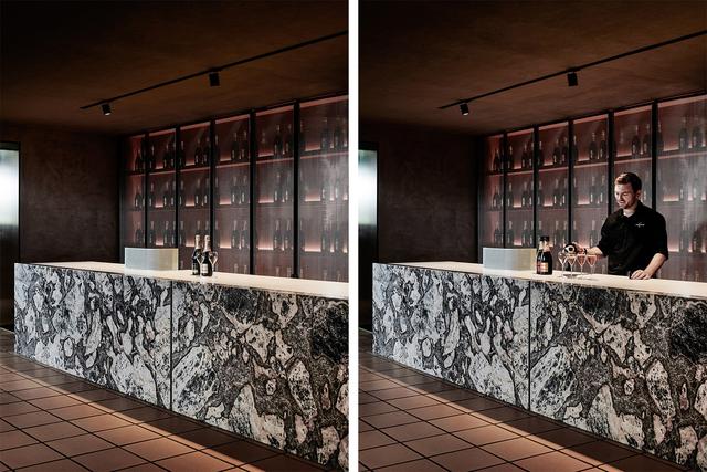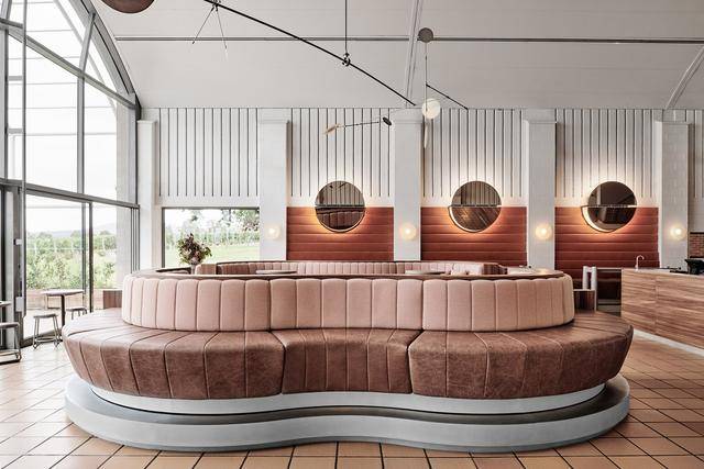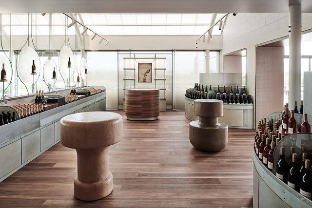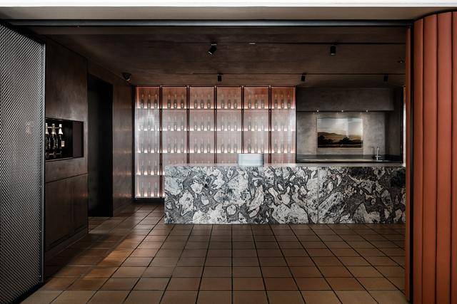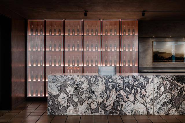 这些设计在向Chandon酒庄法式传统致敬的风格也有所体现中,同时设计也保留了一种年轻化的特征,这种年轻风格与香槟酒庄中相对新近成立的酒品种呼应。陈年皮革与天鹅绒搭配黄铜灯具的长条软凳,展露出一种巴黎小酒馆的美感。虽然设计师通常从国际化和能够经历时间考验的角度寻求灵感,他们也致力于与当地材料和制作者一同合作。斑点橡木地板和细木工为昆士兰本地艺术家“Dreamtime“大理石突出的纹理图案和印花纹理增添了柔软和温暖的特征。