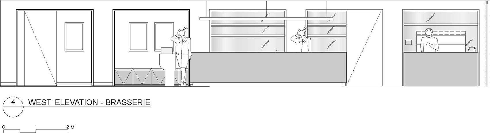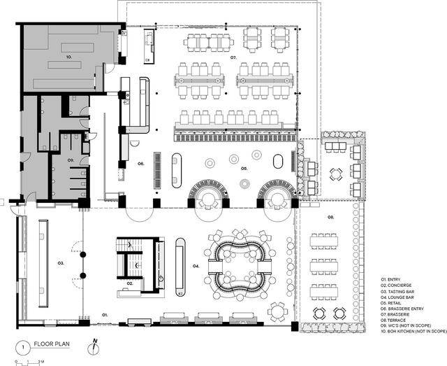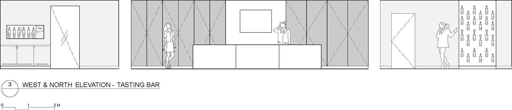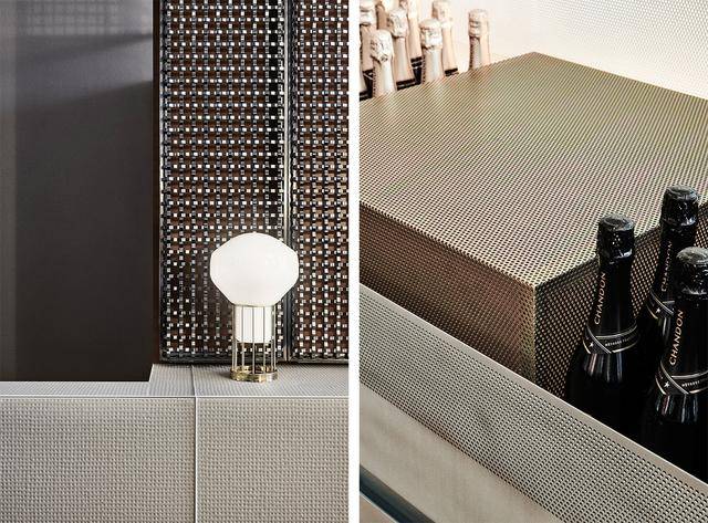 预算管理要求保留现有的1980年代工业结构——拱型天花板和硬质表面构成的巨大空间。因此设计师必须采用精妙的声学处理,建筑内部通过大胆的设计手法融合在一起。设计师探寻了材料随时间流逝的变化、不同处理过程和相互之间作用所产生的效果,最终研究结果呈现在对不同金属的应用和处理上。同样的,酿酒过程为每个空间设计提供了依据。“压缩/释放“应用在封闭私密的空间如品酒区,酒廊则是流动和充满活力的。透气性编织材料与厚重不透明的材料并置,暗示起泡酒厚重与轻盈的双重性。