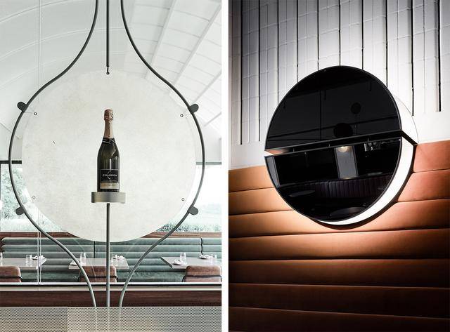 一个悬挂在中央长椅区上方可移动的漂浮装置是与当地金属工匠一同合作的设计的。动态、漂浮和微妙的重量,这个悬挂着的动态雕塑轻柔地随着酒吧的韵律摆动,投射出闪亮的金属光泽,趣味性的呈现气泡不可预测的本质。