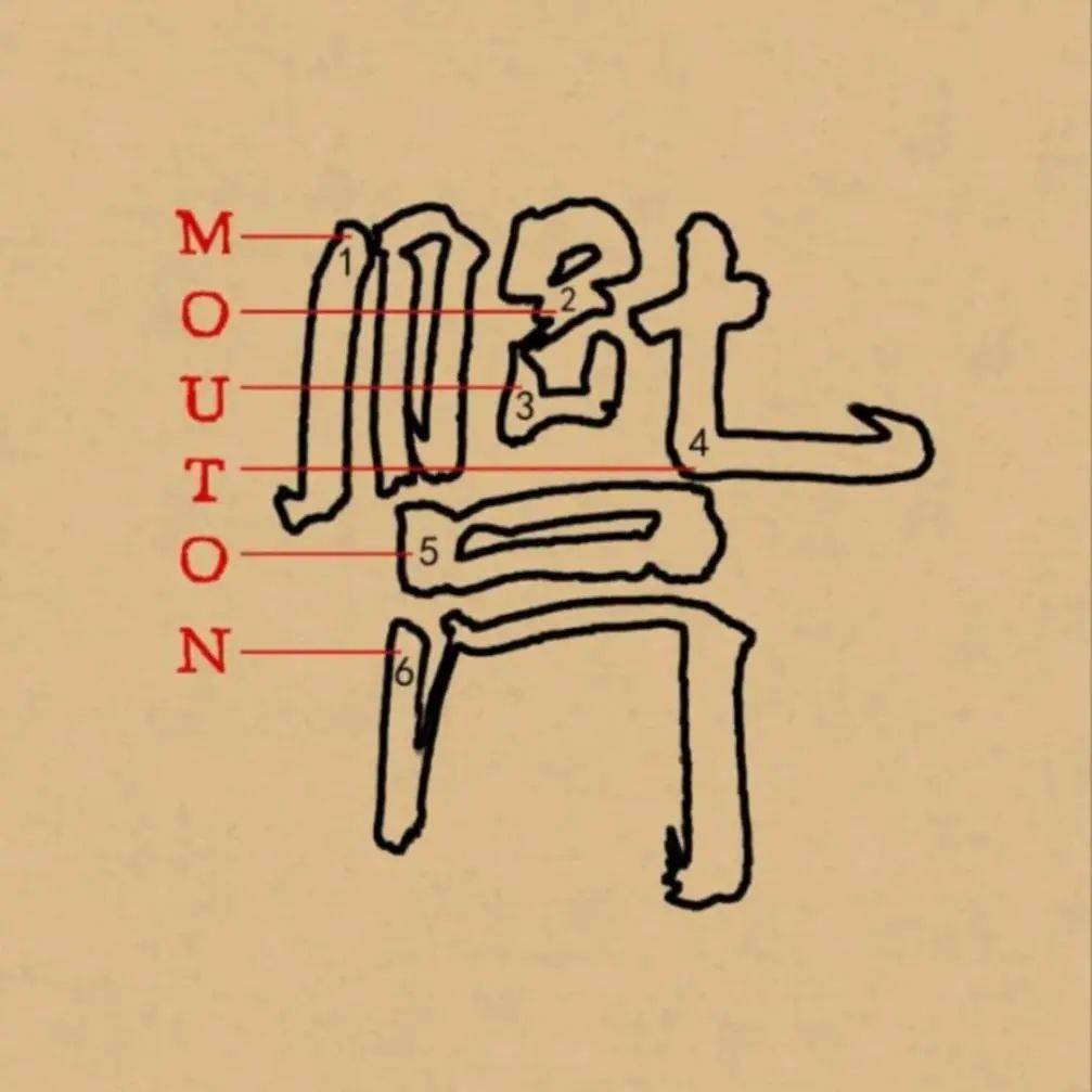 MOUTON 的几个字母分别化身汉字书法的样式,共同组成了好似汉字一般的方块文字形象。