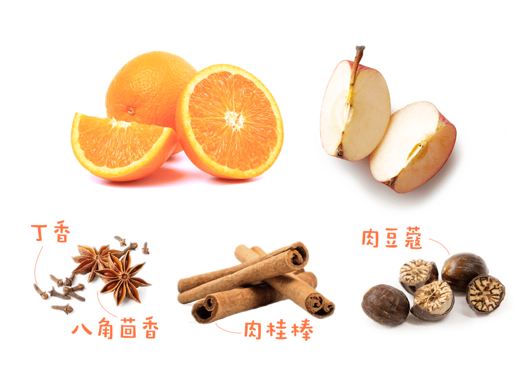 配比嘛,大概每半瓶红酒放1个橙子,1根肉桂棒,1颗八角,3颗丁香,1个肉豆蔻。如果煮的多,按比例增加。糖、苹果、柠檬大家自己斟酌。