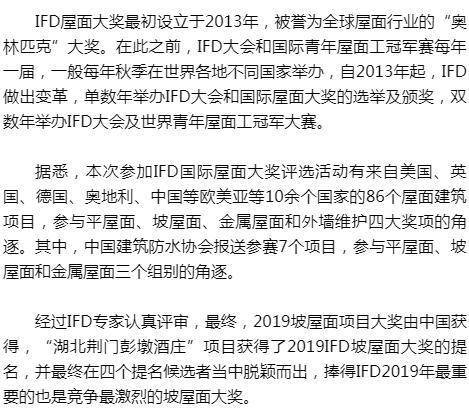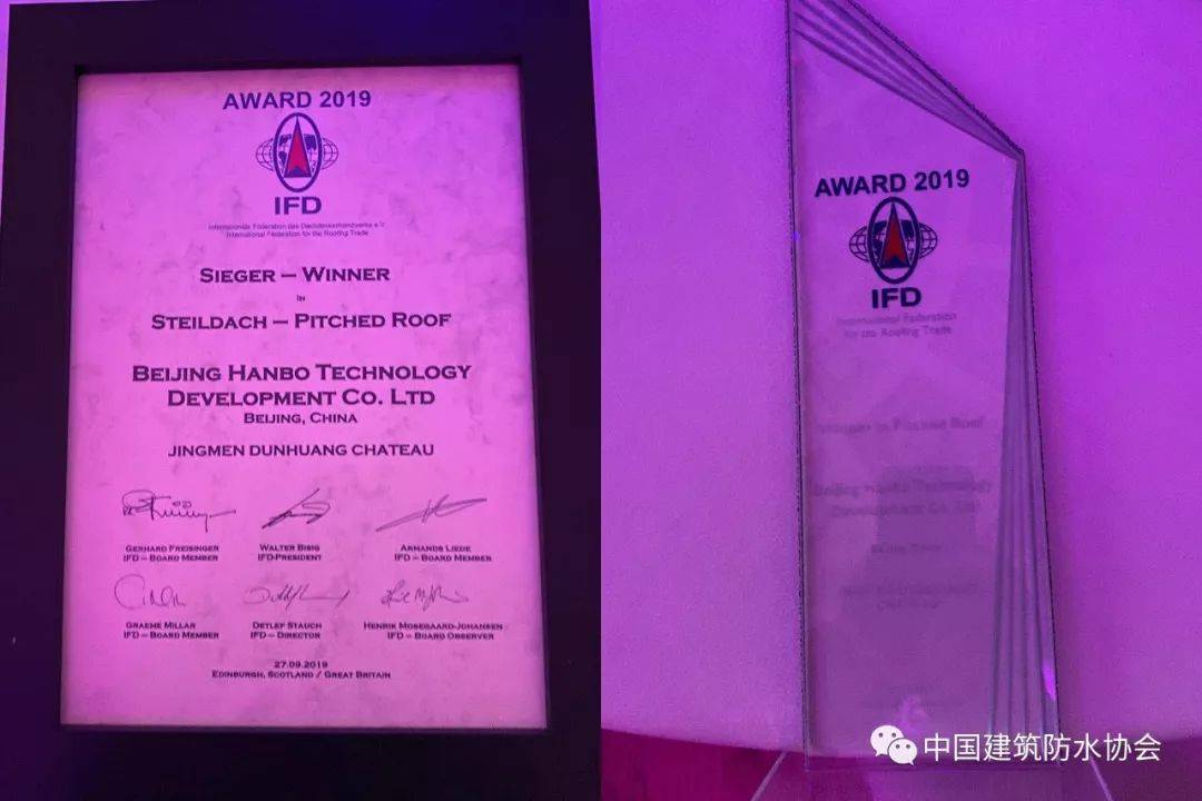 在英国举行的英国爱丁堡第67届国际屋面联合会(IFD)上,蓝裕文化发展有限公司设计的“荆门彭墩酒庄”项目荣获2019IFD坡屋面工程冠军大奖。这也是中国防水项目首次荣获国际屋面行业的“奥林匹克”大奖。
