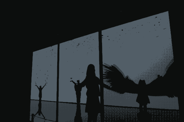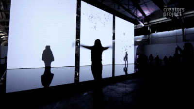 当参与者站在白色巨幕面前,做出伸展姿势时,自己的影子就会变成巨大的翅膀展翅飞翔,如果你想去摸一下它,它又瞬间幻化成无数只的小鸟飞散而去,如同幻影一样消失不见,是不是很有趣?