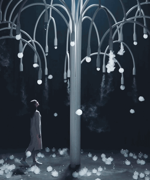 这个神奇的装置艺术作品名为New Spring,以日本樱花节的樱花盛开场景为灵感,通过树上一颗颗会往下掉的花苞来表现繁华飘落时,唯美和伤感交织的自然时刻。