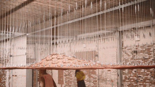 这是一道长17m的动力墙装置,由再生塑料搭配弹簧骨架组成,当你穿过装置时,它会随着你的运动轨迹弯曲变化、膨胀起来。