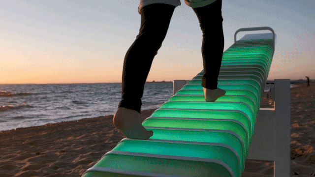 跷跷板原本就是童趣的象征,设计师结合科技与艺术,创造了一个发光并伴有音乐的跷跷板,让每个人都可以参与的玩乐项目,塑造了美妙的城市艺术氛围。