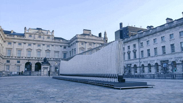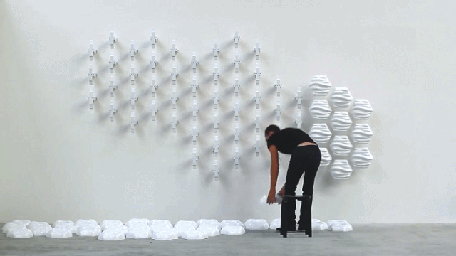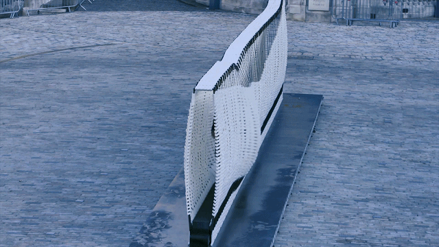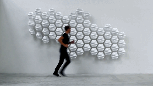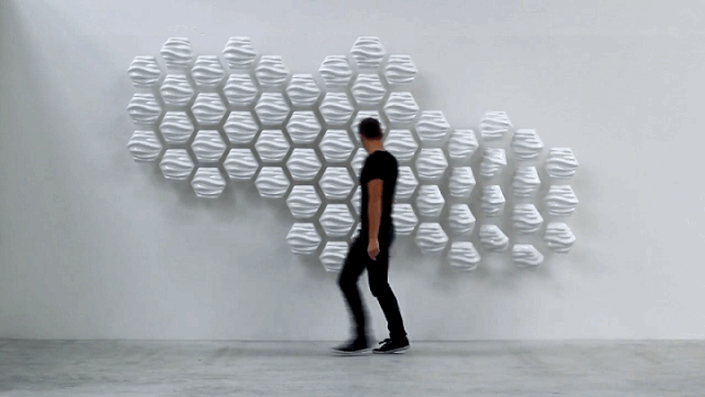 这是一面可以与人互动的墙,该装置由60个单元模块构成,每个模块可单独活动,更神奇的是所有模块可以反映人的行为,整体产生波动或与人的动作发生联动反映。