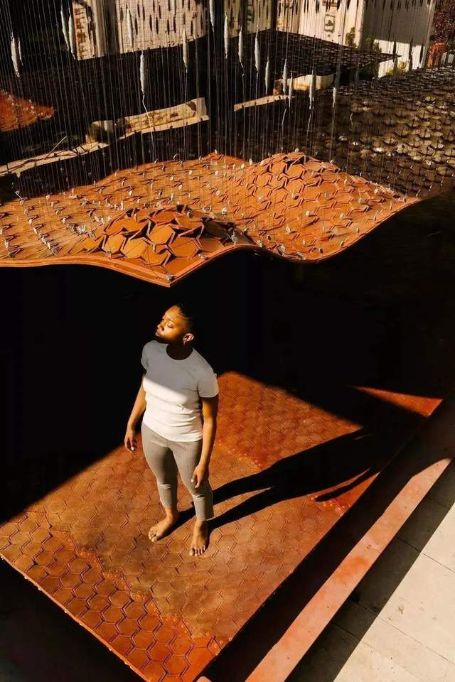 这是由一个破旧仓库改造而成的创意动力装置,顶部装置通过不锈钢弹簧和滑轮系统连接,当参观者踏上地板时,参观者的脚步动作带动脚下的弹簧,弹簧启动滑轮带动头顶上方的顶棚开始变动。