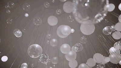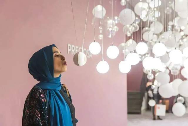 这是款会呼吸的灯,观众可以像小时候玩吹气泡游戏一样,对着灯具轻轻吹气,灯光便会依次亮起,在呼吸之间,上千颗水晶灯便点亮了整个空间,让人仿佛置身于梦境之中。