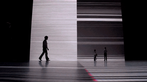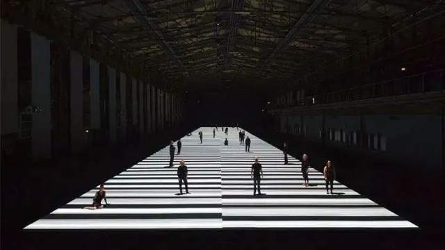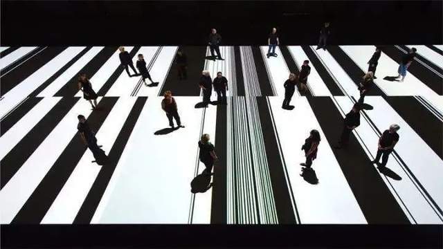 屏幕上那些类似于黑白琴键的线条会根据现场观众的活动轨迹长短产生变化,与此同时现场的声效也会根据这些反复变化的黑白线条进行重新解析转化,也就是说这个交互装置作品的表现形式取决于现场的观看者,从而形成装置与观看者的互动,让观看者直接走进作品中。