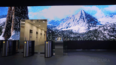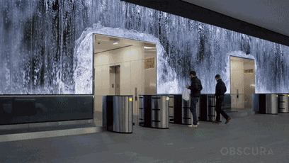 CG waterwall位于旧金山SalesForce公司大楼的大厅内,设计师将“瀑布”搬进了写字楼,这块瀑布墙长达108英尺、配有超过700万像素的LED,加上逼真的音效,仿佛真的身处飞流直下的瀑布面前。