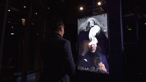 “The Year’s Midnight”是一件“灵异”的互动装置,当现场观众站在”镜子”面前观看时间过长时,就会看到”镜子”里面眼窝部分不断冒出白烟,直到浓重的烟雾充满整个屏幕,除非你逃离镜子,面前的烟雾才会逐渐消散。